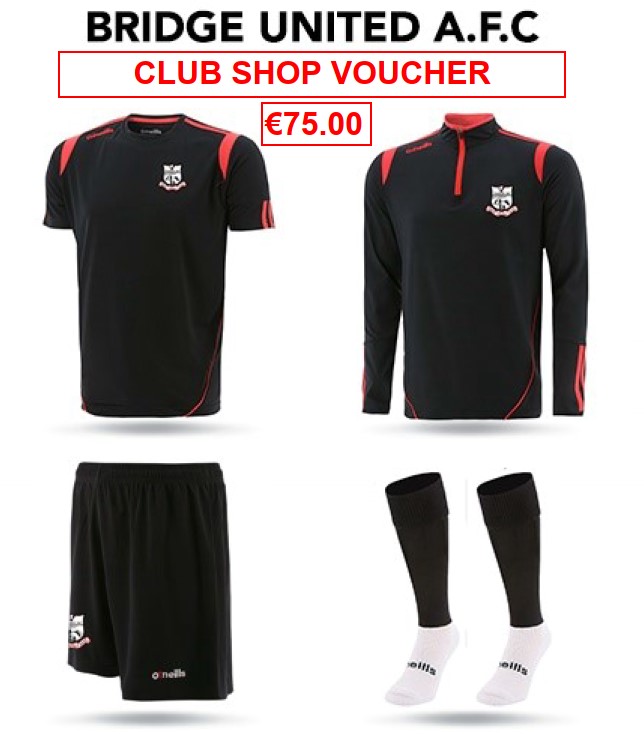 SelectThis voucher can be used towards the purchase of any Club Merchandise currently on offer through our website. To avail of your voucher please email your order through to bridgeunited67@gmail.com. Please include details of any items required including size and quantity for each item.