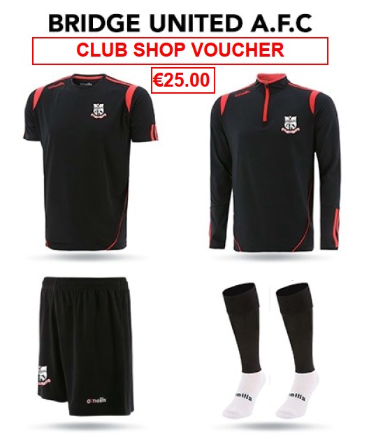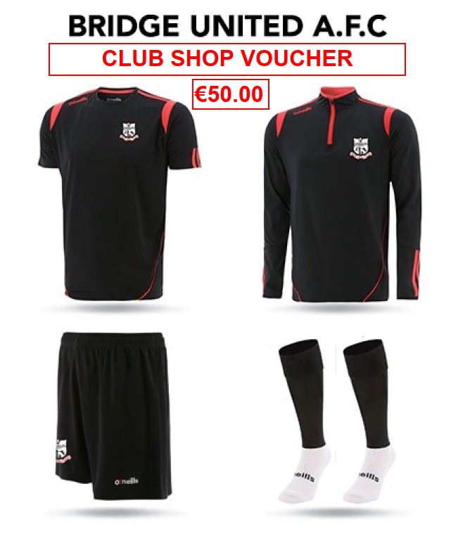 SelectThis voucher can be used towards the purchase of any Club Merchandise currently on offer through our website. To avail of your voucher please email your order through to bridgeunited67@gmail.com. Please include details of any items required including size and quantity for each item.